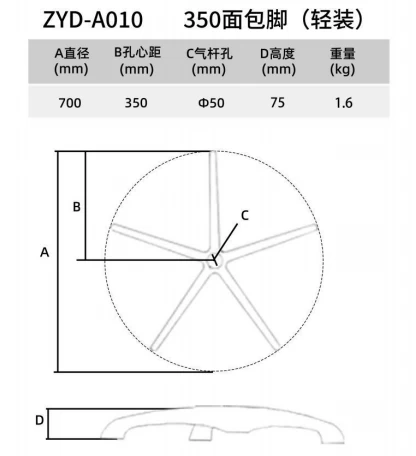 The 350 Bread Feet (Light) component is engineered for efficient performance with a reduced weight. It features a 50mm inner hole diameter and a 700mm overall size, with a height of 75mm. Weighing 1.6kg, this component offers a lightweight yet sturdy solution for various applications. Its design ensures ease of handling and installation, while maintaining reliable support and durability. This makes it an ideal choice for situations where a lighter component is needed without compromising on strength.